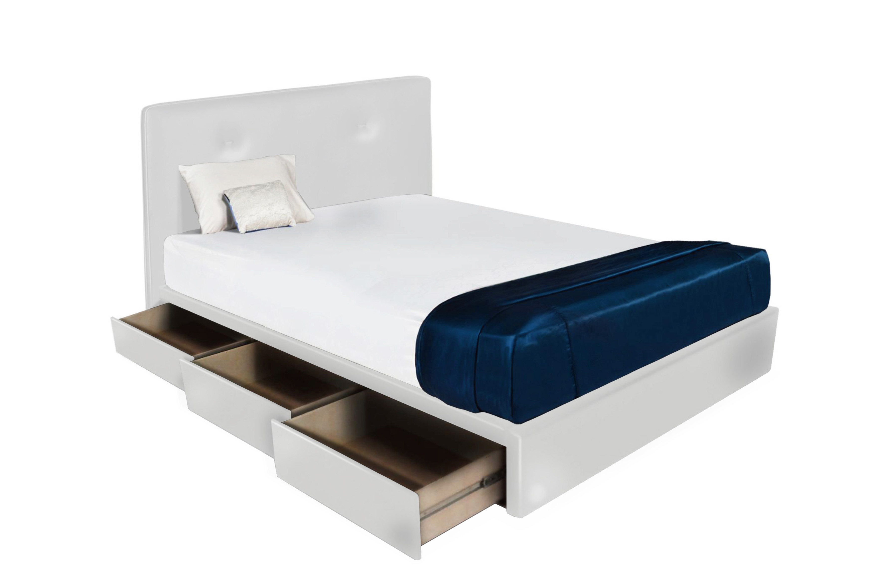 Discover the Darwin Bedframe: A Thailand-crafted blend of elegance and function. White with half-leather accents, it features a simple design and 3 drawers for storage.