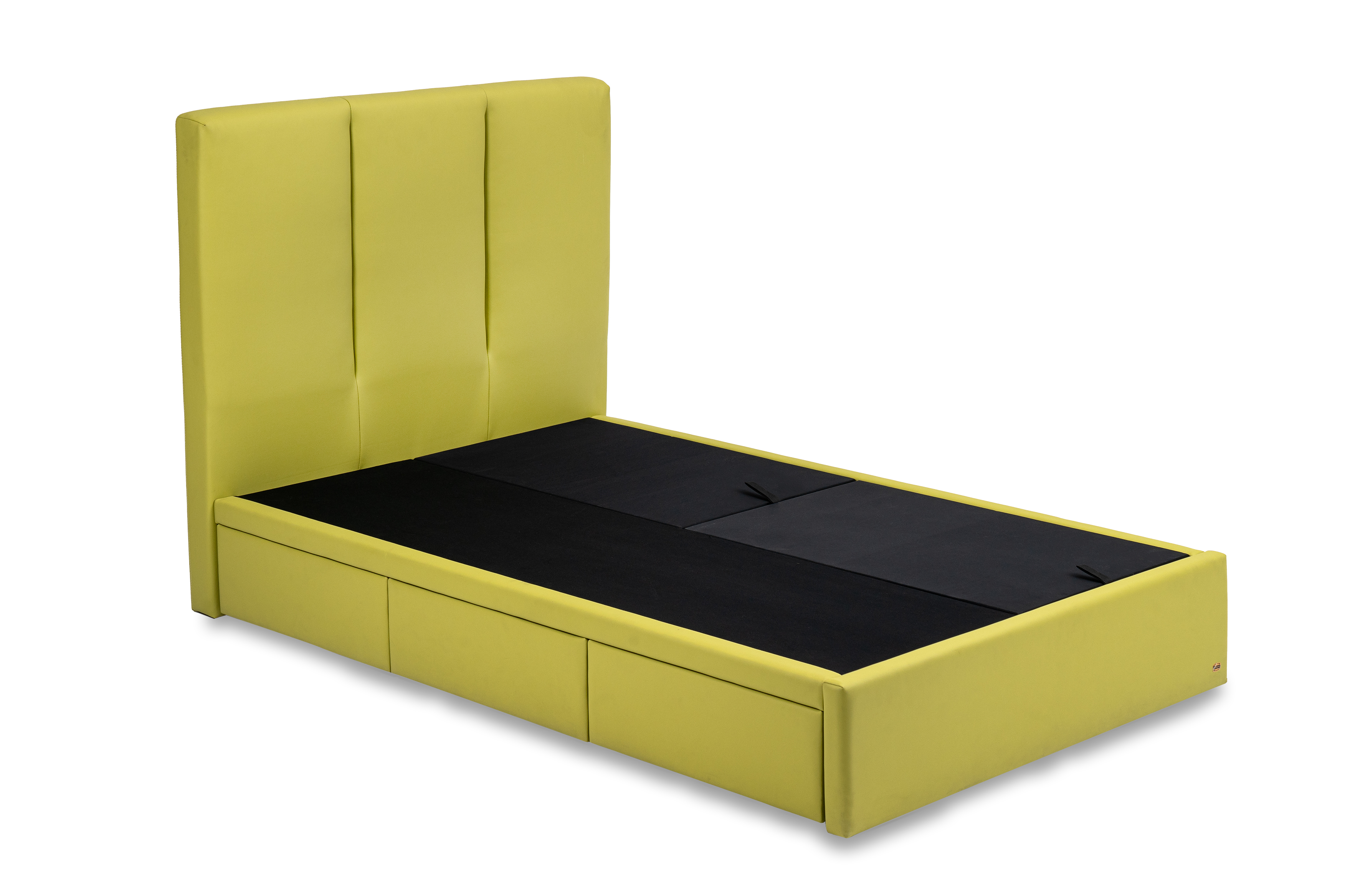 Meet the Marcus Bedframe: Bold kiwi green, crafted in Malaysia with synthetic leather. Features 3 drawers for storage.