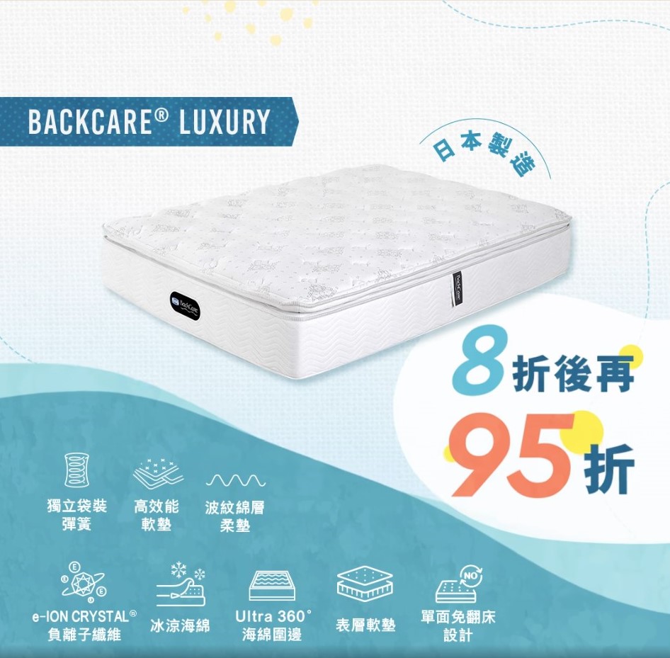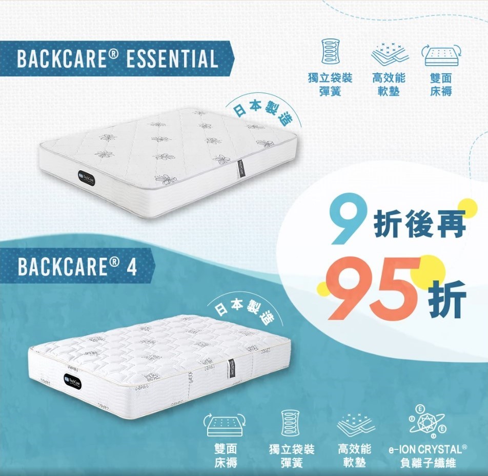 配備獨立袋裝彈簧及高效能軟墊,承托力及透氣度十足,而且雙面床褥可以定期反轉,增強耐用度。BackCare® 4床褥更具備能夠釋放負離子的e-ION CRYSTAL® 纖維,締造健康優質睡眠。