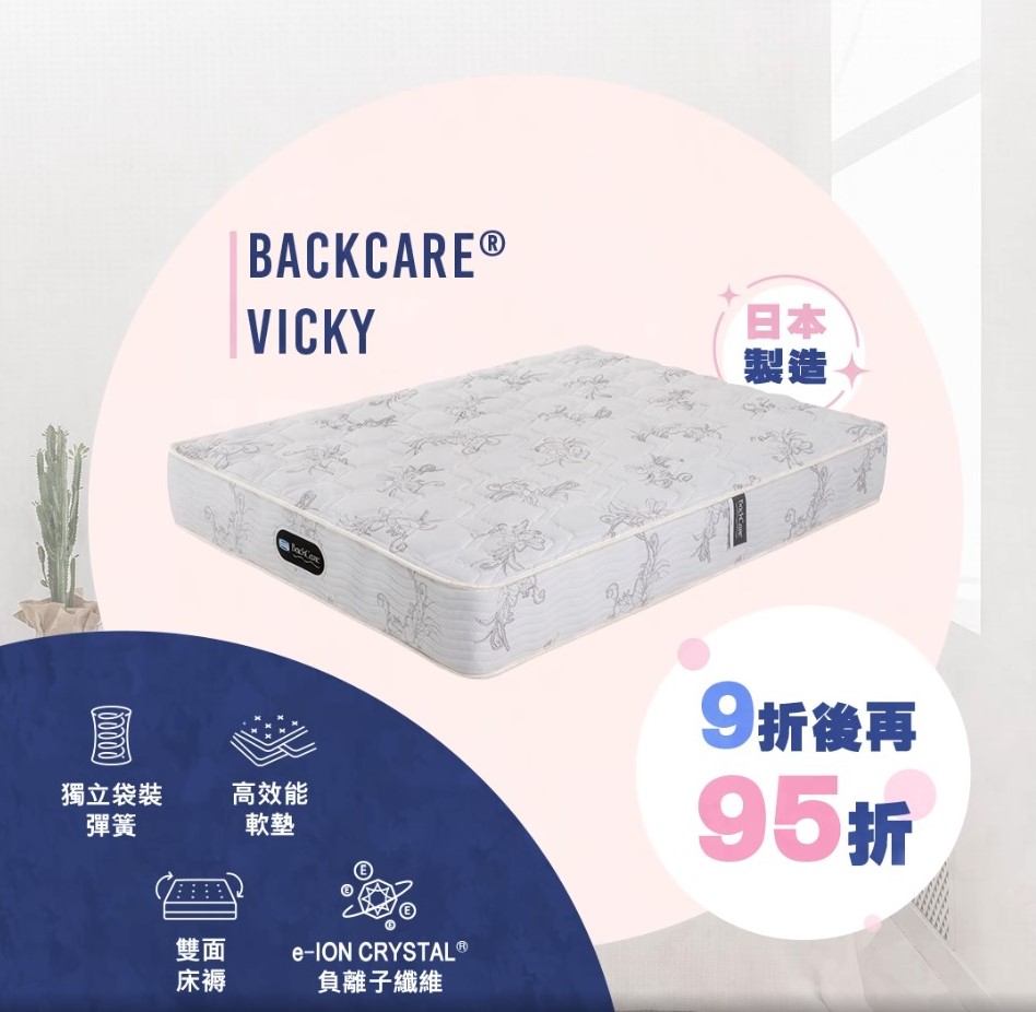 內置獨立袋裝彈簧及高效能軟墊,Vicky加入e-ION CRYSTAL® 負離子纖維,負離子能夠中和正離子,有助舒緩疲勞同壓力
