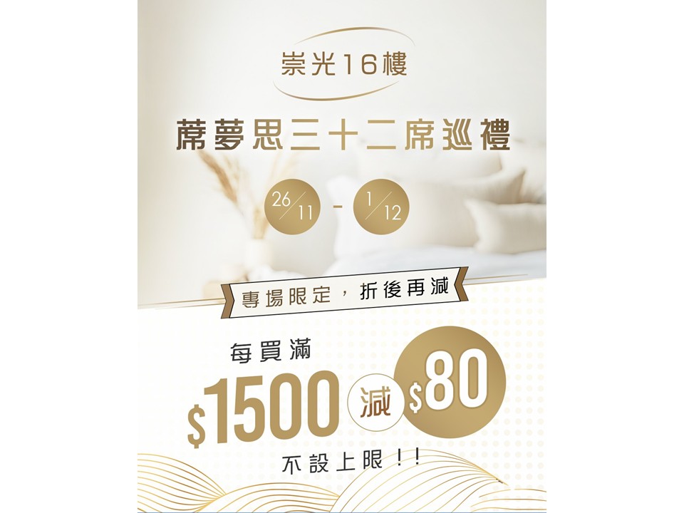 Register an Eligible Card then spend a cumulative net amount of every HK$16,000, in-person at Simmons shops in Hong Kong by 2025/12/31, to receive HK$700 statement credit, up to 2 times per registered Card. Terms & Conditions apply.