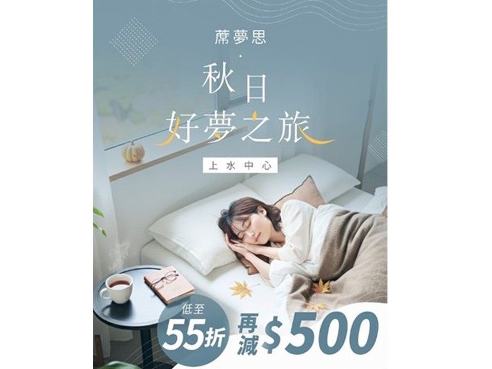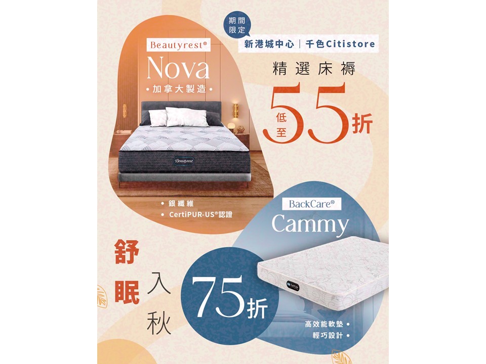 Simmons® has a limited-time mattress popup event on the 3rd floor of Ma On Shan MOSTown from October 11 to 23. Featured mattresses include the Canadian-made Beautyrest® Nova at 45% off and the Japanese-made BackCare® Cammy at 25% off. Grab the chance to upgrade your sleep quality with these great deals!