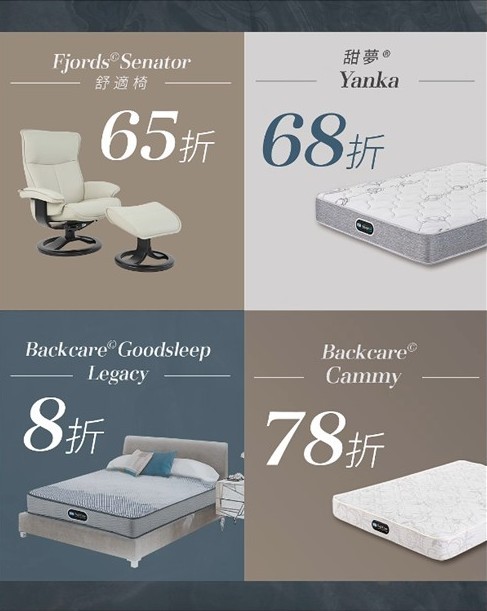 New arrivals include Beautyrest® Ultimate Calm and BackCare® Goodsleep Jayden, both at 20% off. Other popular mattresses like Beautyrest® Yanka are up to 32% off, Backcare® Cammy at 22% off, and Goodsleep Legacy at 20% off. Fjords® Senator recliner is 35% off.